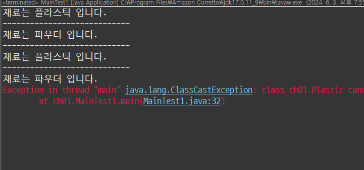Plastic plastic01 = (Plastic)dPrinter3.getMaterial(); // 다운 캐스팅