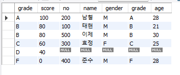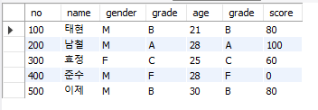 -- insert into tb_student(no, name, gender, grade, age) values('100', '길동', 'F', 25, 'B');