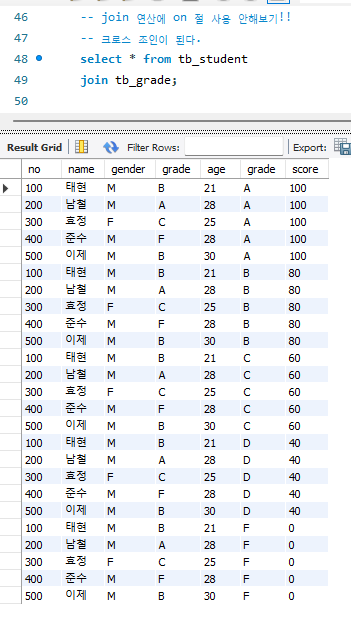 -- JOIN 연산에 ON 절 사용 안해보기 !!!