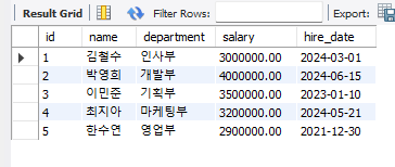 (1, '김철수', '인사부', 3000000.00, '2024-03-01'),