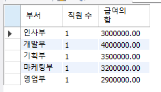 -- 문제2 각 부서별로 직원 수를 세고, 부서별 급여의 합을 계산하세요