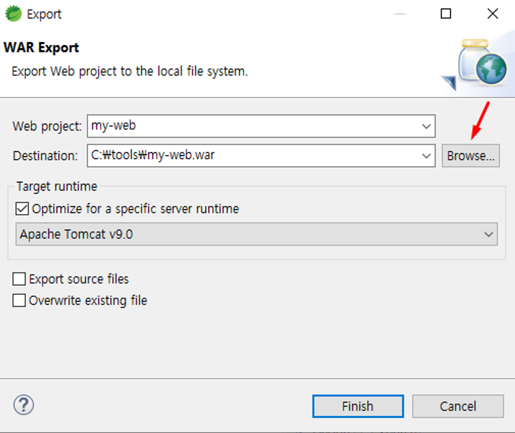- Destination 필드에 WAR 파일을 저장할 경로를 지정합니다.