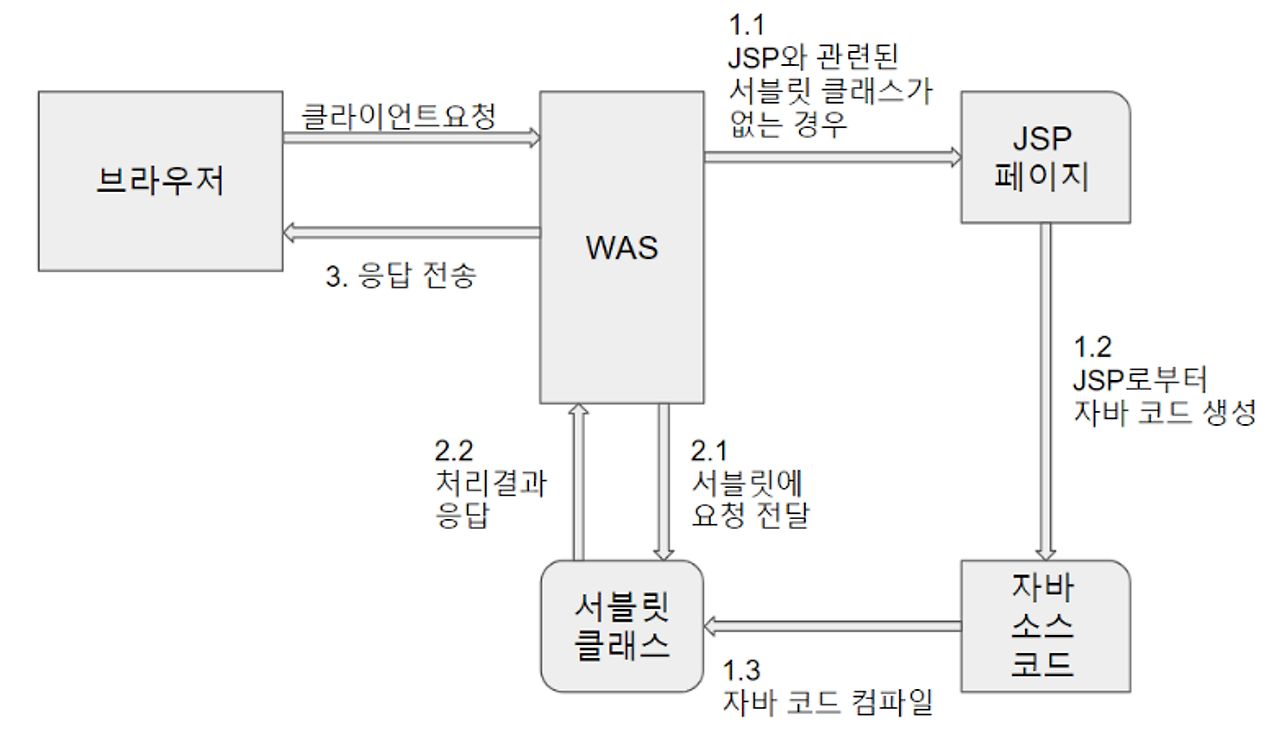 JSP를 실행한다는 말은 곧 JSP 페이지를 컴파일한 결과인 서블릿 클래스를 실행한다는 의미가 된다.