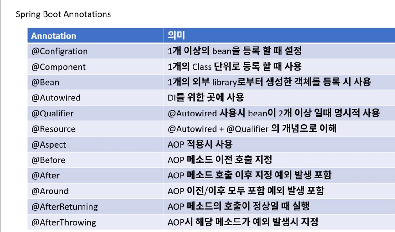 - @Autowired: 의존성 주입(Dependency Injection)을 수행할 때 사용되며, 필드, 생성자, 메서드에 적용할 수 있습니다.