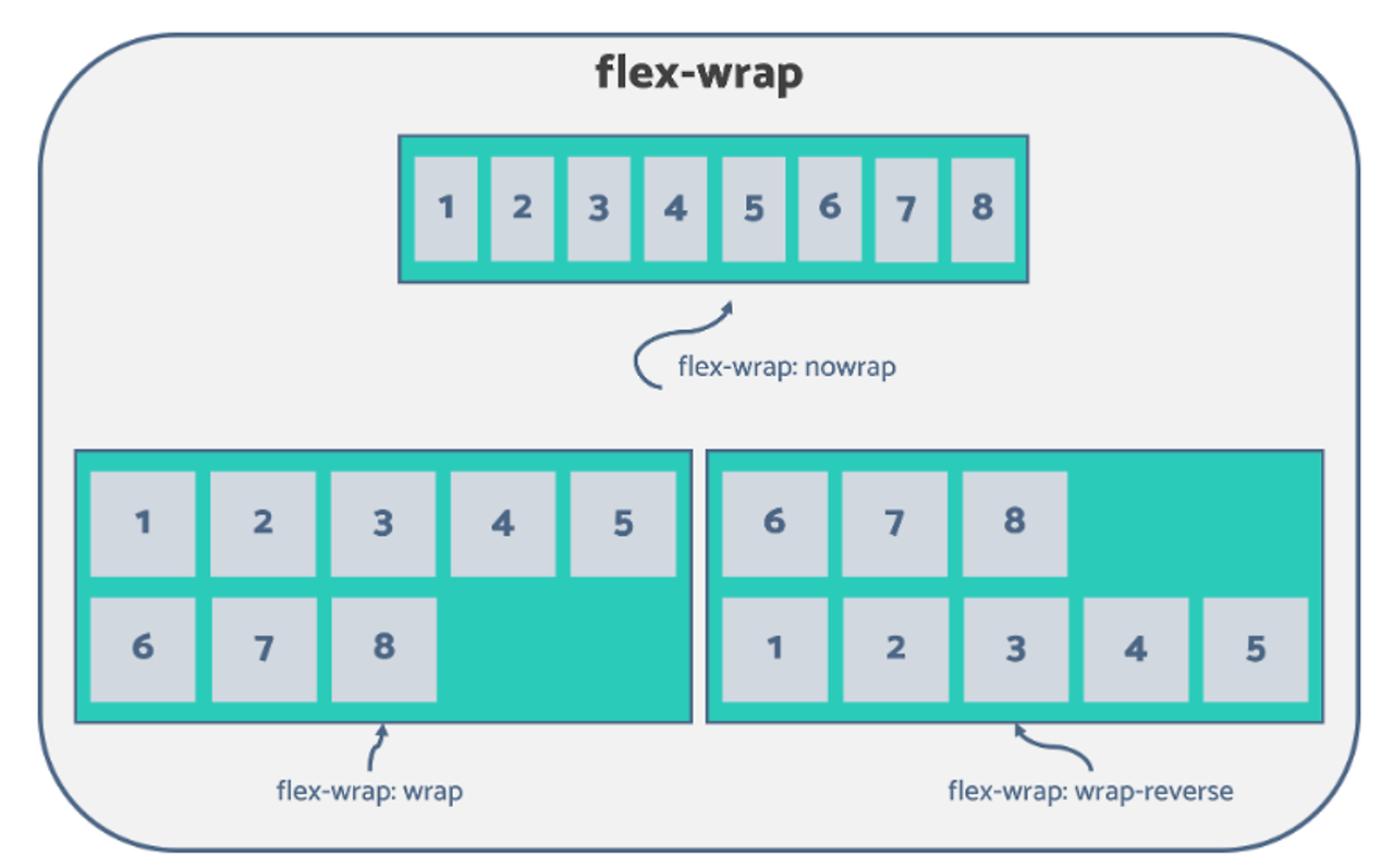 - wrap-reverse : 아이템들을 여러 줄에 걸쳐 반대 방향으로 배치합니다. wrap과 동일하게 줄 바꿈이 일어나지만, 아이템들이 반대 방향으로 쌓입니다.