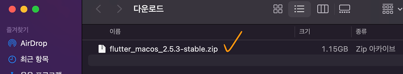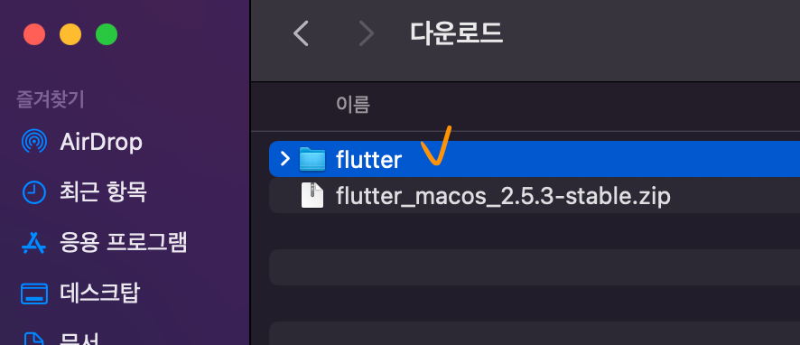 💡 만약 압축이 해제된 폴더 이름이 아래 사진과 다른 경우 flutter로 변경해 주시기 바랍니다.