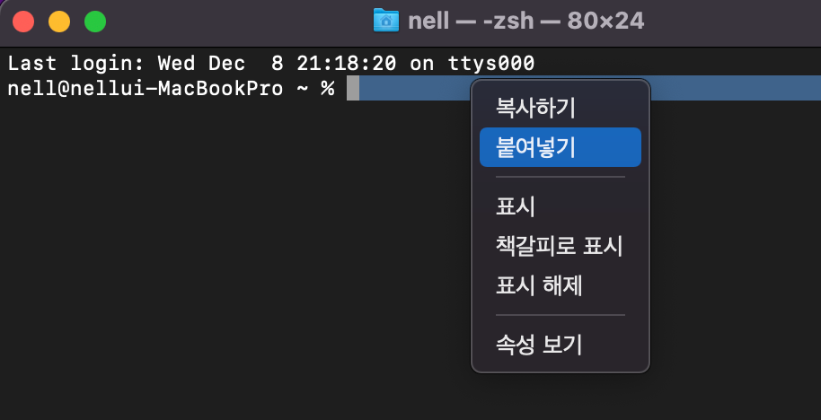 5. 터미널에 단축키 Cmd + v 또는 마우스 우클릭하여 붙여넣기 를 눌러주세요.