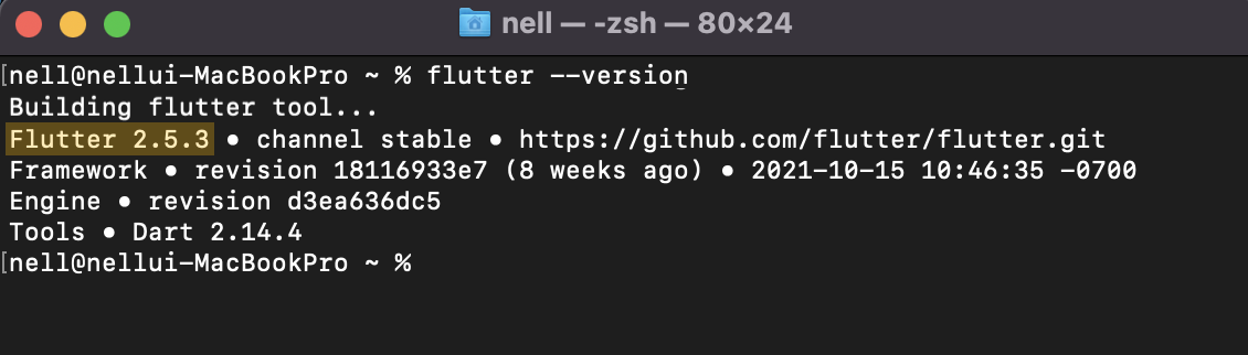 실행하면 Building flutter tool... 이라고 출력되고 잠시 후 아래와 같이 Flutter 버전이 출력되면 Flutter 설치 완료!