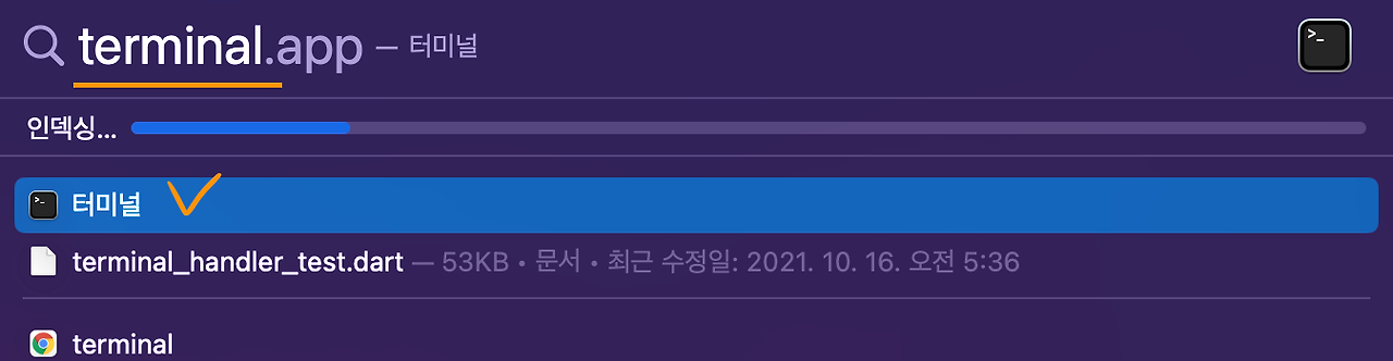 - Spotlight에 terminal 이라고 검색한 뒤, 아래와 같이 하단에 터미널 프로그램이 보이면 엔터를 눌러주세요.