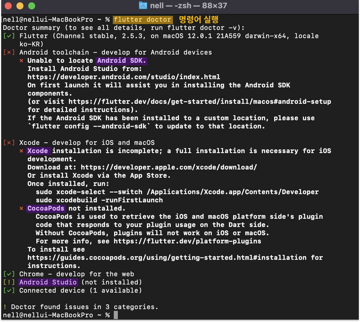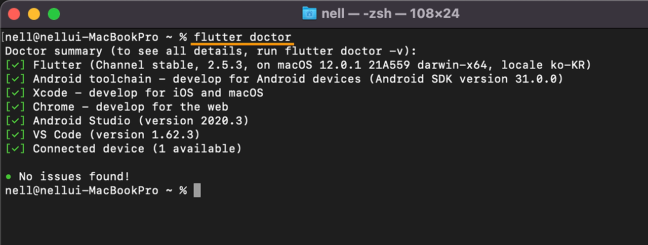 터미널에서 flutter doctor라고 검색한 뒤 아래와 같이 화면이 나온다면 모든 설치가 완료하신 것입니다.