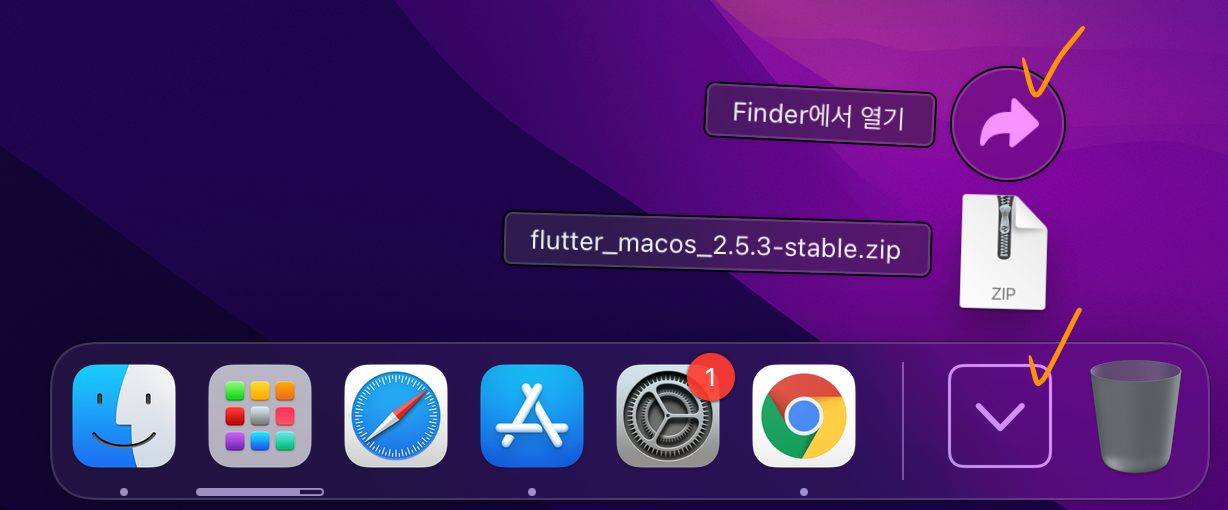 5. 바탕화면에서 휴지통 우측에 있는 다운로드 폴더를 선택한 뒤 Finder에서 열기 버튼을 눌러 주세요.