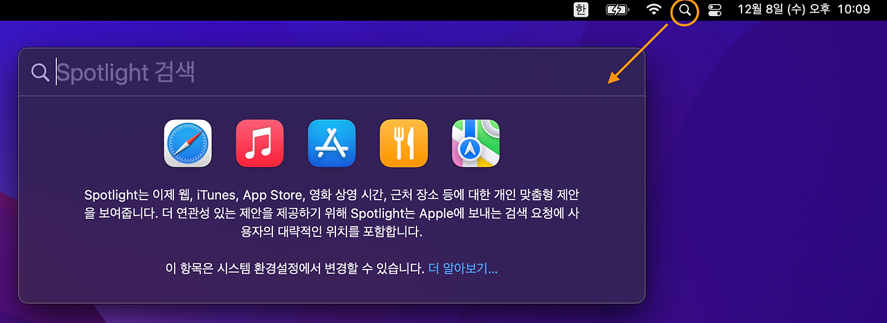 - macOS 우측 상단에 돋보기 🔍 아이콘을 선택해 주세요. 그러면 아래와 같이 Spotlight 검색 창이 뜹니다.