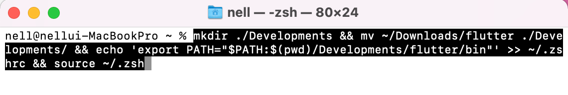mkdir ./Developments && mv ~/Downloads/flutter ./Developments/ && echo 'export PATH="$PATH:$HOME/Developments/flutter/bin"' >> ~/.zshrc && source ~/.zshrc
