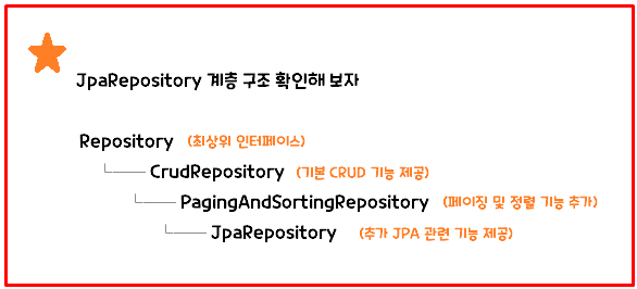 - JpaRepository (추가 JPA 관련 기능 제공)