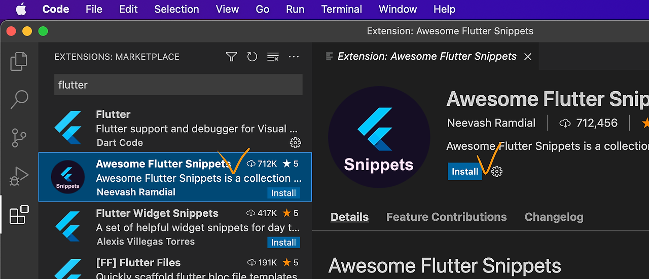 3. 바로 아래에 있는 Awesome Flutter Snippets 익스텐션도 설치해주세요.