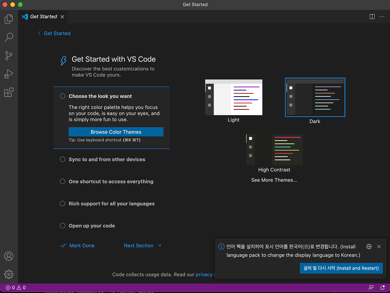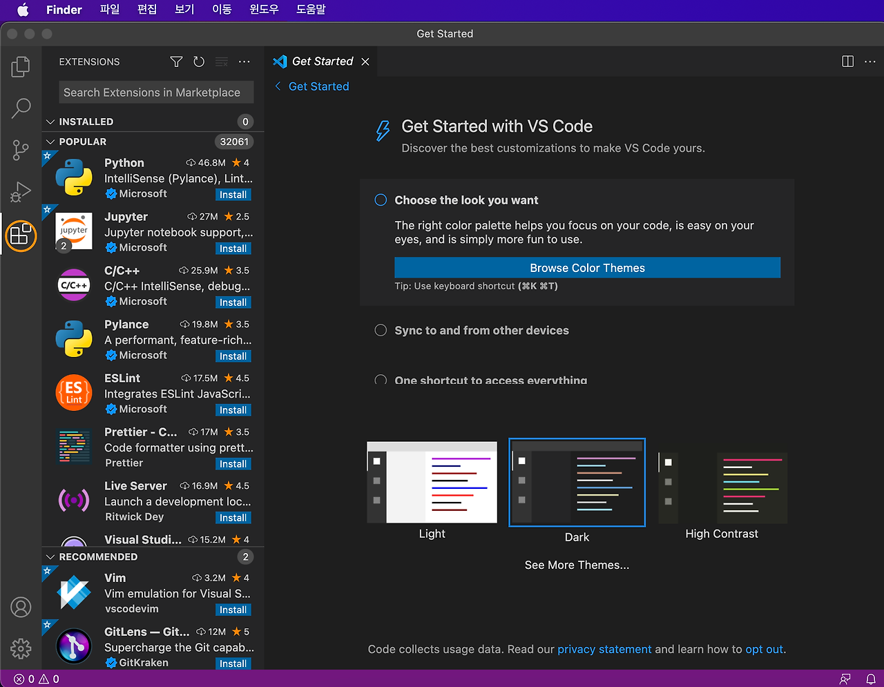 9. 그러면 아래와 같이 VSCode가 실행되면 설치 완료!