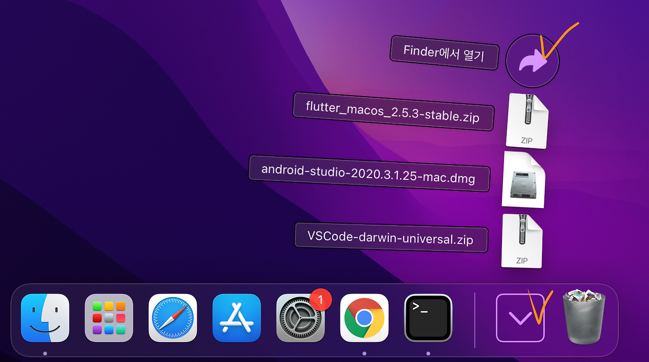 4. 바탕화면에 다운로드 폴더를 클릭한 뒤 Finder에서 열기 버튼을 클릭해 주세요.