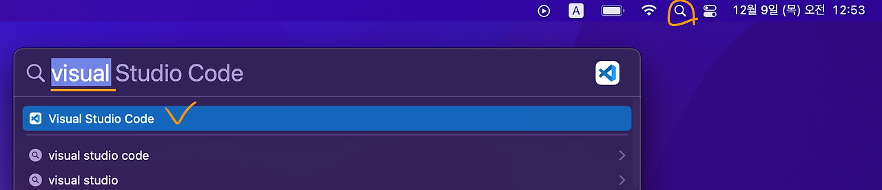 7. 화면 우측 상단 돋보기 🔍 아이콘을 클릭한 뒤 visual 이라고 검색해 주세요. 그리고 하단에 Visual Studio Code가 보이면 엔터를 눌러 실행해 주세요.