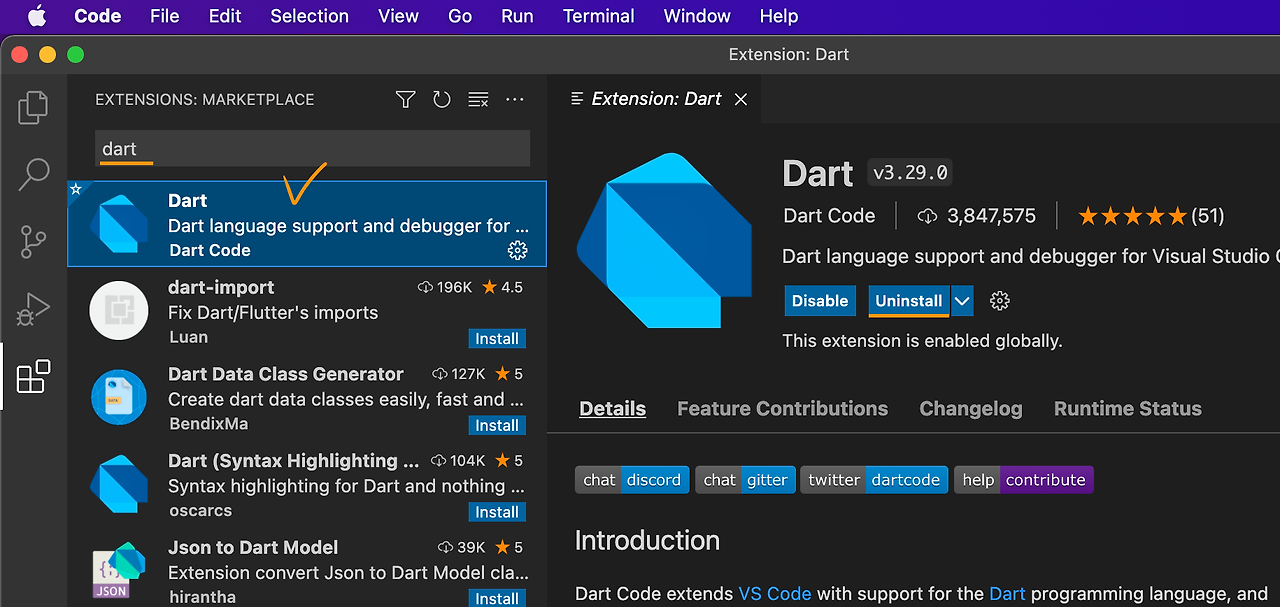 4. dart 라고 검색하신 뒤, 해당 익스텐션을 설치해주세요. 만약 uninstall이라고 뜨신다면 이미 설치가 되셨으니 넘어가시면 됩니다.