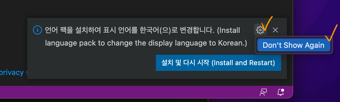해당 알람을 다시는 보지 않으려면 우측 톱니바퀴 ⚙ 아이콘을 누른 뒤 Don't Show Again을 선택해 주세요. (만약 사라져서 버튼을 누르지 못했다면 다음번에 눌러주세요!