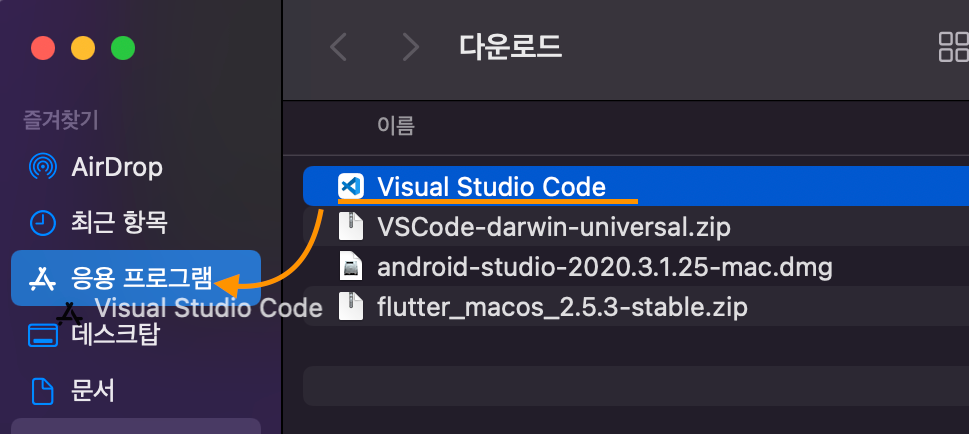 6. 압축이 풀리고 생성된 Visual Studio Code 파일을 드래그해서 왼쪽 응용 프로그램에 떨어뜨려 주세요.