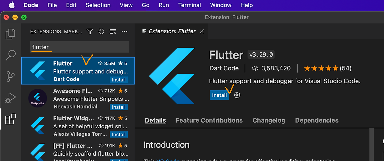 2. flutter 라고 검색한 뒤, 해당 첫 번째 항목을 선택하고 install 버튼을 눌러 설치해주세요.