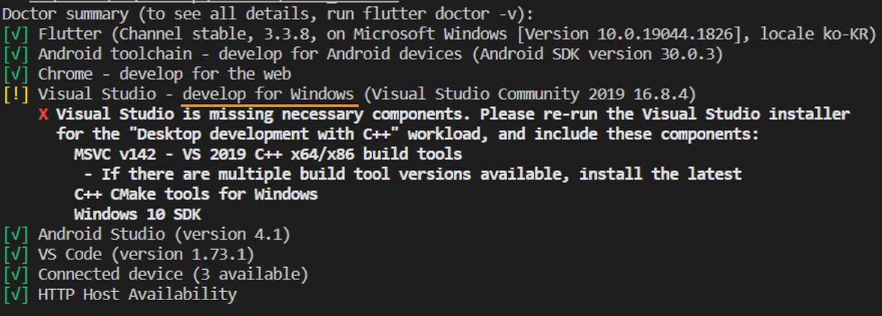 💡 Flutter 최신 버전에서 window 개발도 지원하기 시작하면서 flutter doctor를 입력했을 때 아래와 같이 Visual Studio - develop for windows 항목이 노란색으로 뜰 수 있는데, window 개발할 때 필요한 내용이므로 일단 그대로 넘어가셔도 됩니다.