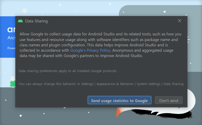 11. Android Studio 사용성 개선을 위해 Google에 데이터를 공유하고 싶으시다면, Send usage statistics to Google 버튼을 누르시고, 그렇지 않으시면 Don't send 버튼을 눌러주세요.