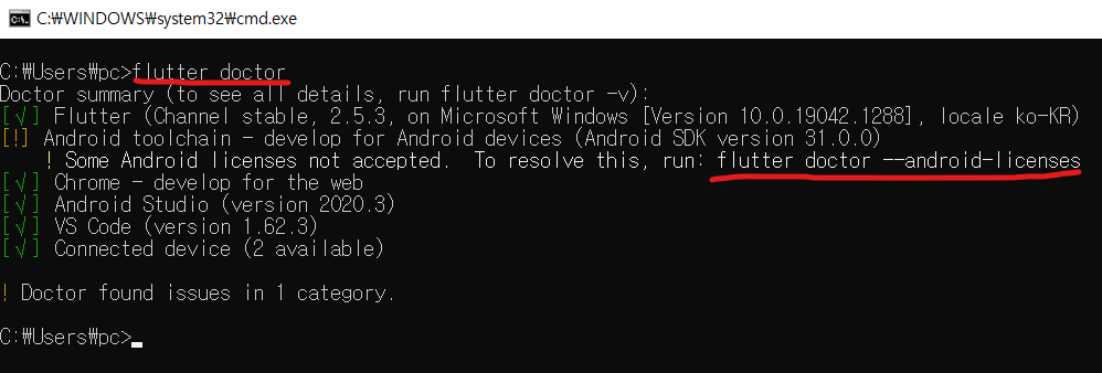 2. flutter doctor라고 입력한 뒤 엔터를 누릅니다. 아래와 같이 Android toolchain의 좌측에 [!] 표시가 되어있습니다.