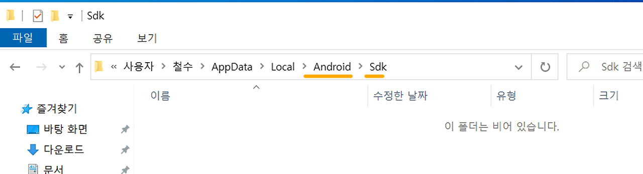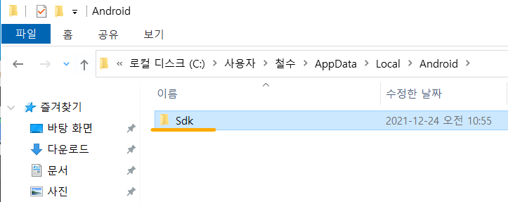 19. 생성한 Android 폴더에 들어간 뒤 Sdk 라는 폴더를 만들어주세요. (대문자로 시작합니다)