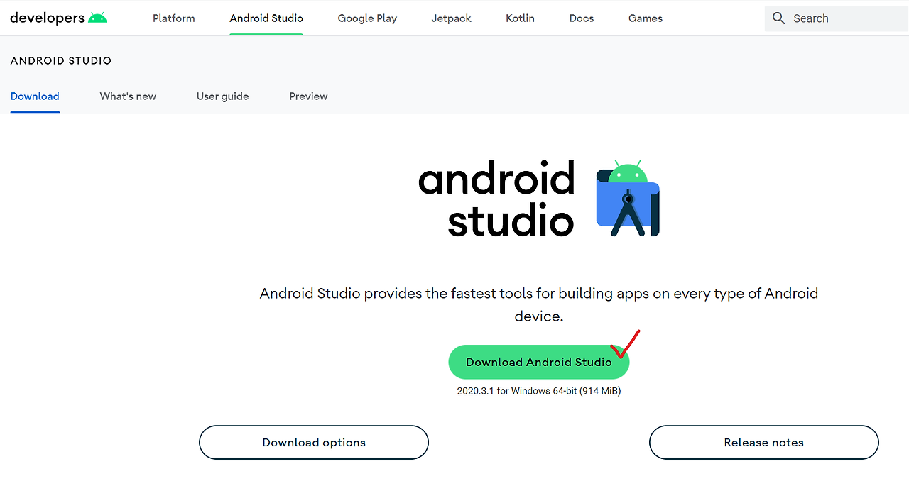 1. 링크 에 접속한 뒤, Download Android Studio를 클릭해주세요.
