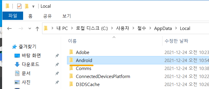 18. 현재 Local이라는 폴더에 들어와 있고, 여기에 Android라는 폴더를 만들어 주세요. (대문자로 시작합니다)