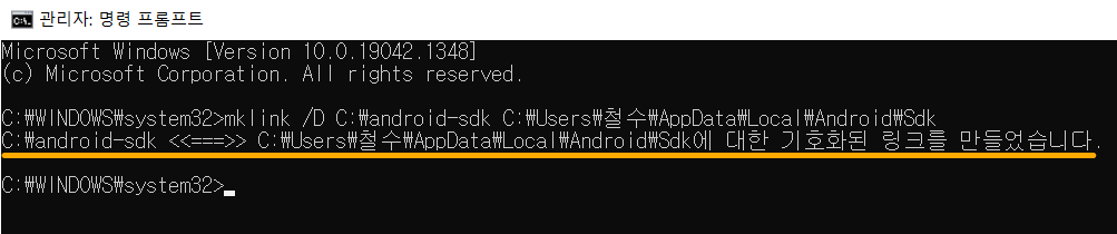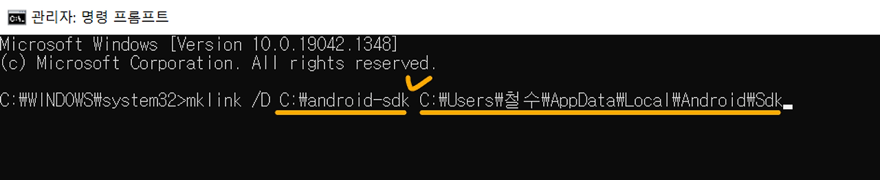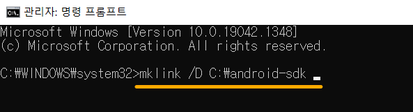 복사한 경로를 명령 프롬프트 android-sdk 뒤에 붙여 넣어주세요. 참고로 아래 그림과 같이 사이에 띄어쓰기가 있어야합니다.