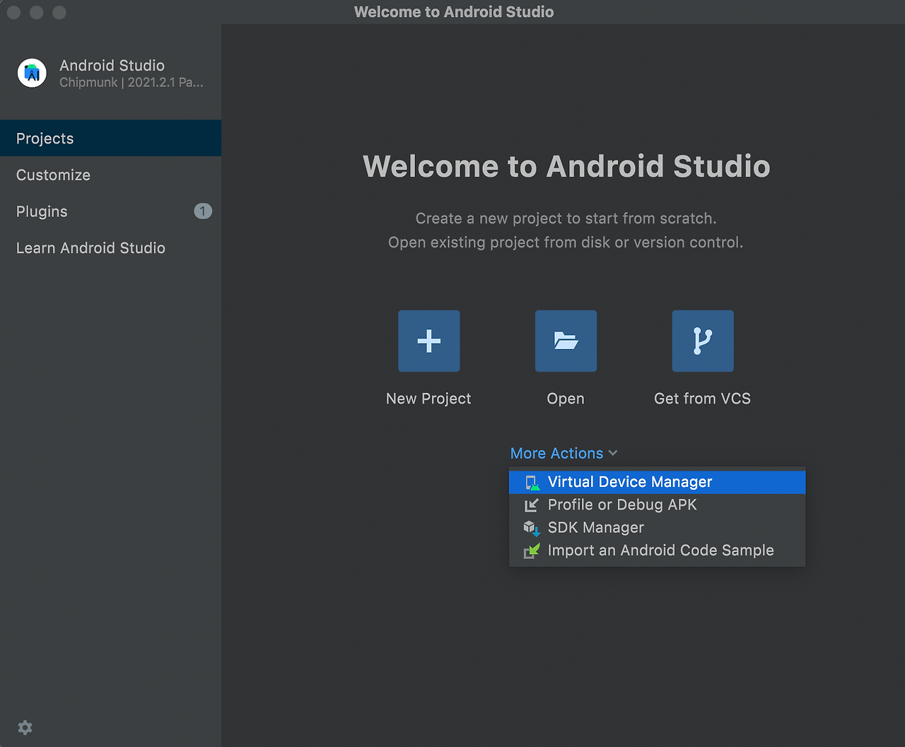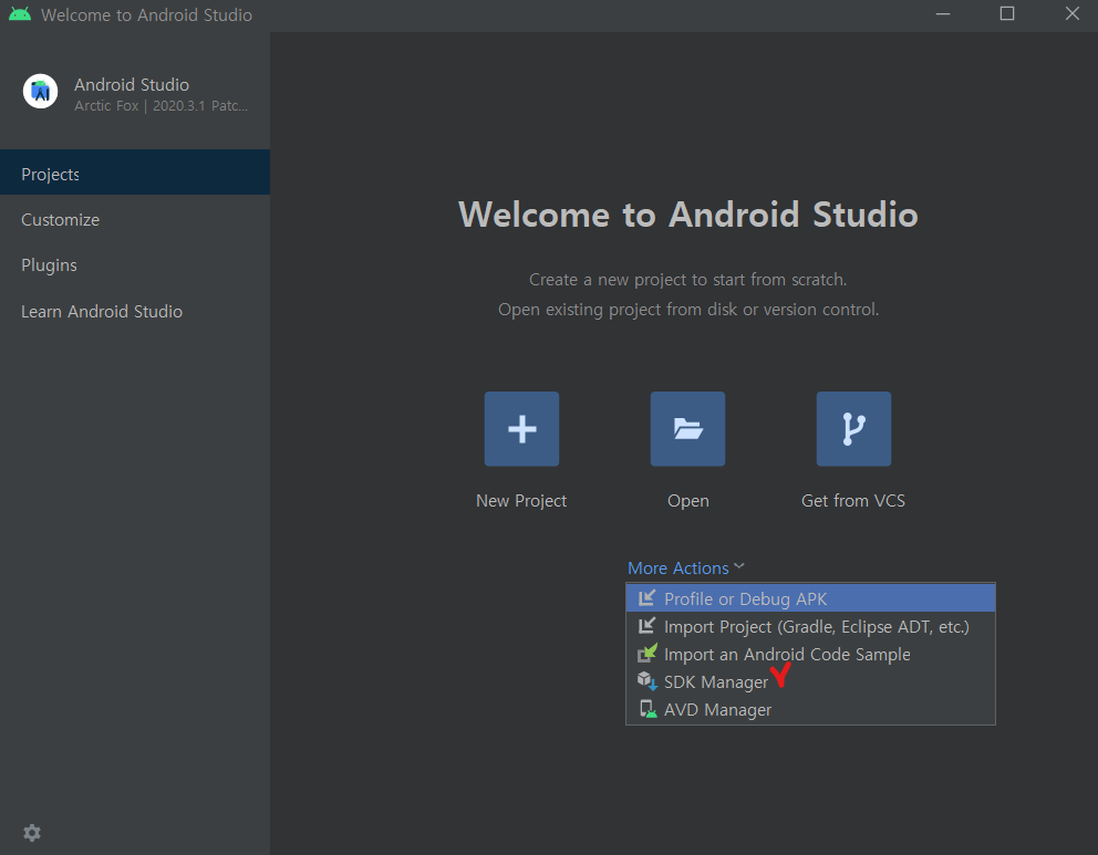 1. 아래와 같이 Android Studio가 실행되면, More Actions를 클릭한 뒤 SDK Manager를 클릭해주세요.