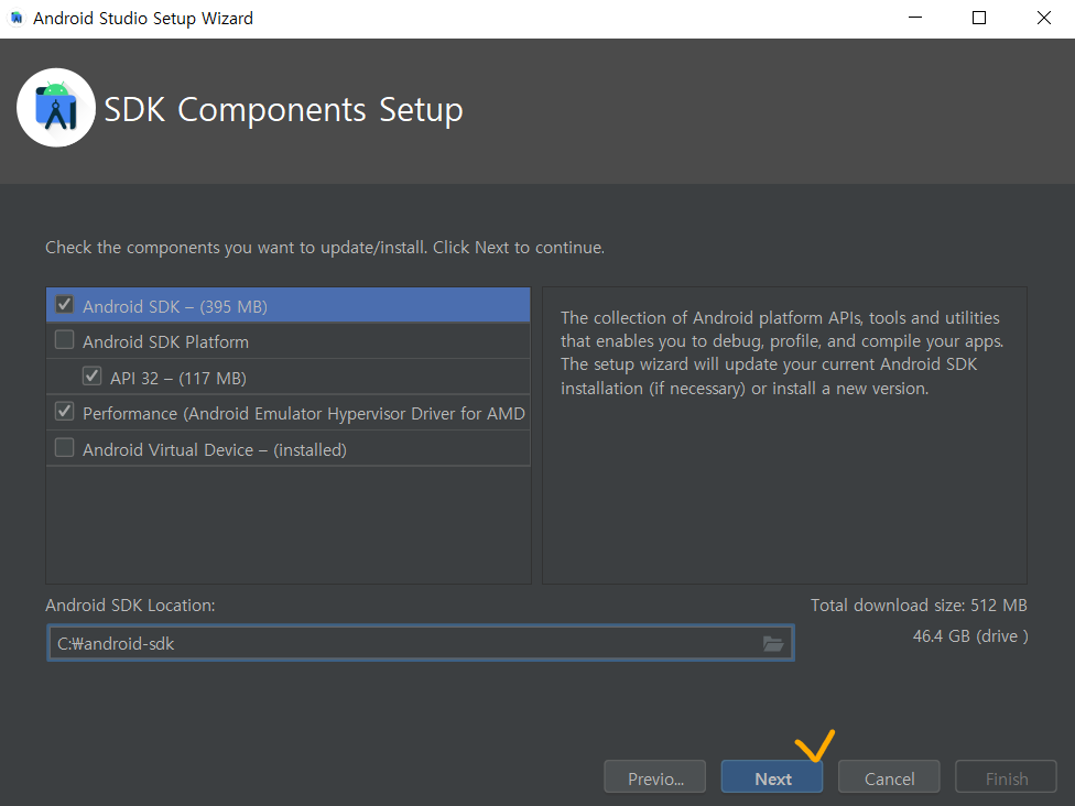 23. 다시 Android Studio Setup Wizard로 돌아와서, 아래 그림과 같이 Android SDK Location 밑에 폴더 아이콘을 선택해 주세요.