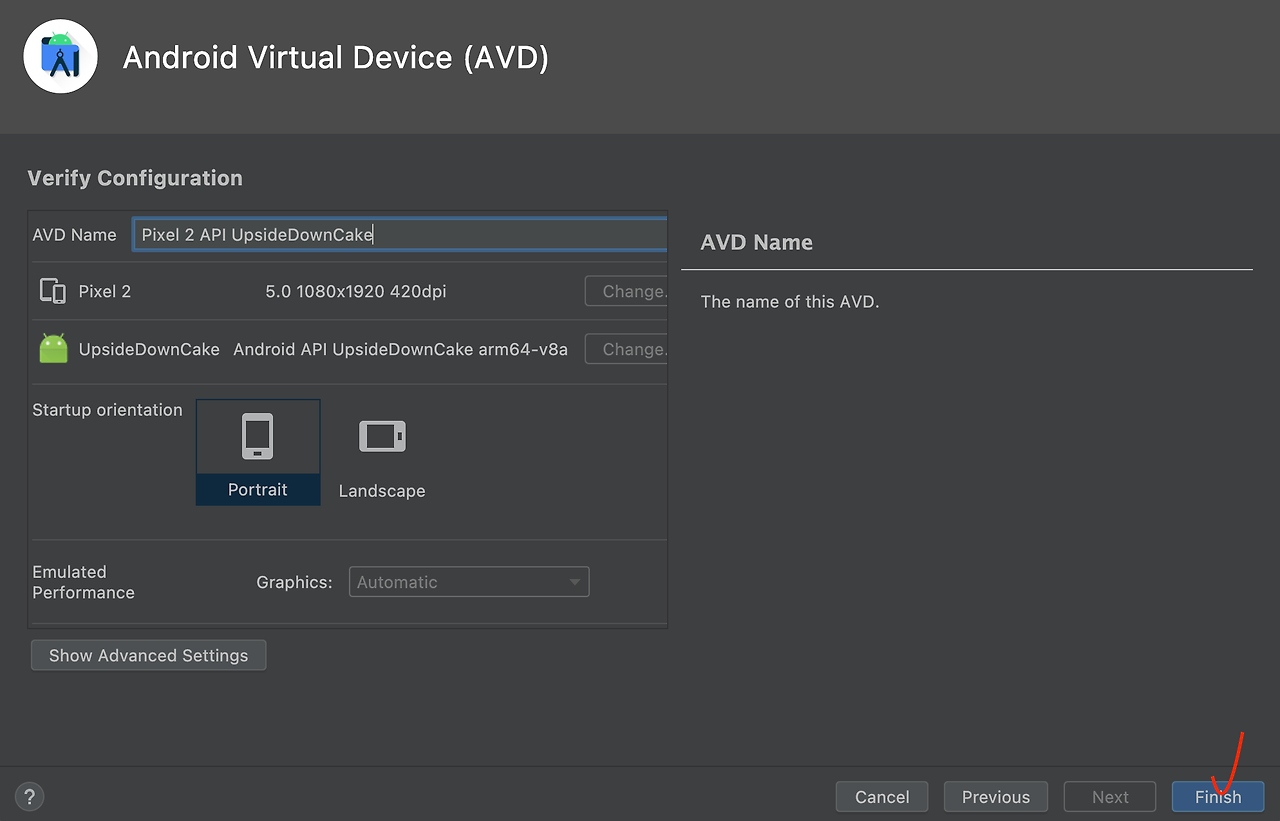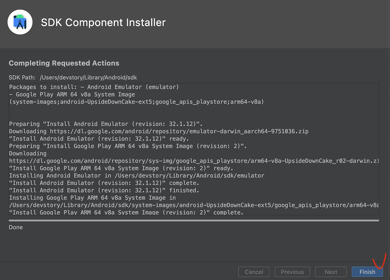 7. Finish 버튼을 눌러 Virtual Device 설치를 완료 해주세요.