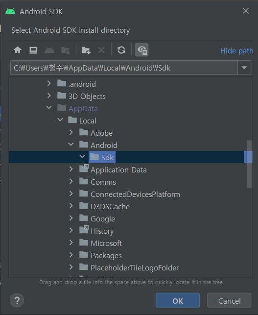 16. 이런 경우, 아래 그림과 같이 Android SDK Location에 C:\Users\내 계정이름\Local까지만 선택해 복사해 주세요.