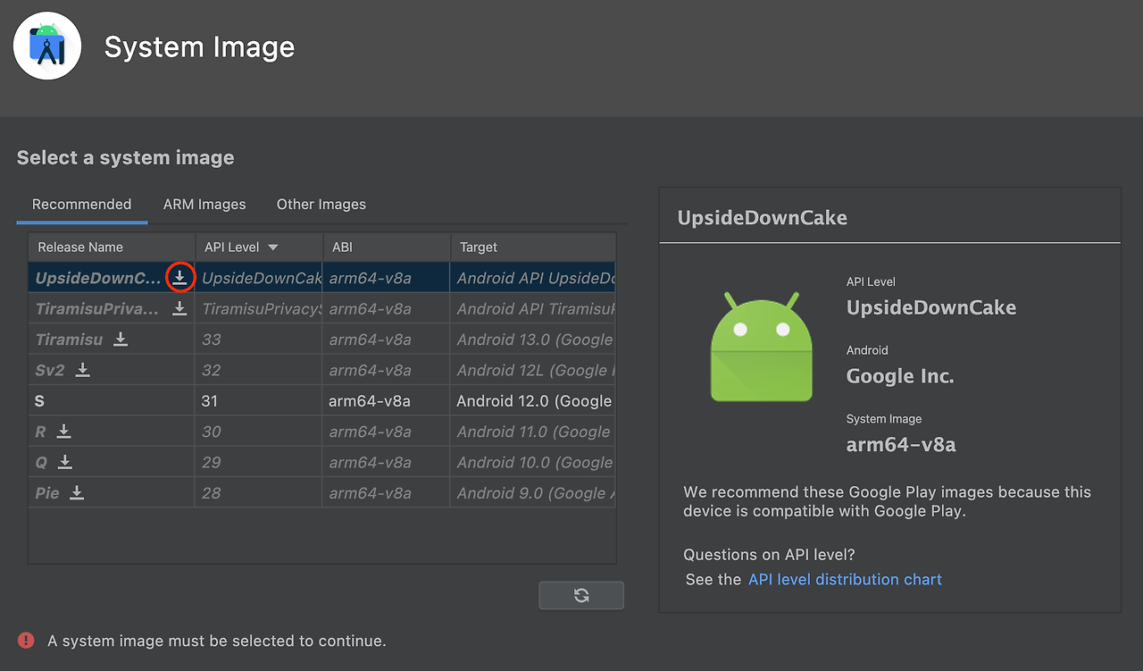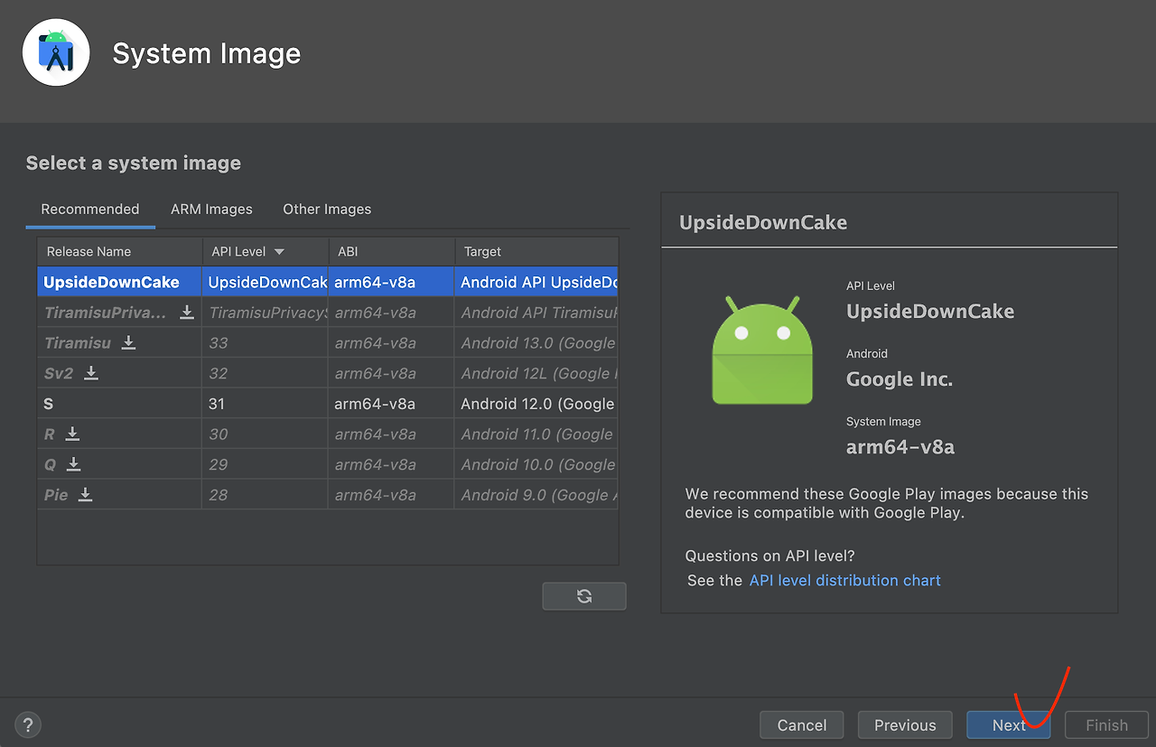 4. 가상 최신 버전 Android OS를 설치해 주세요.