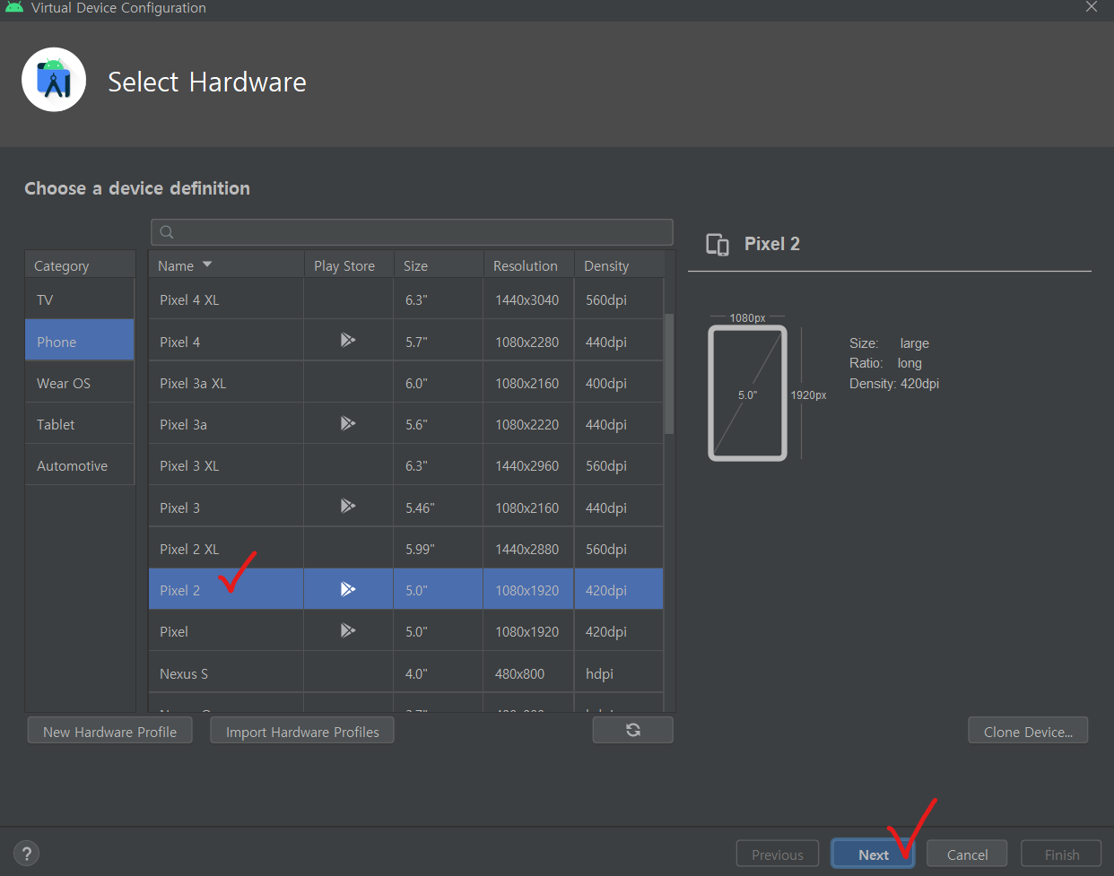 3. 기본적으로 선택되어 있는, Phone → Pixel 2 디바이스를 Next 버튼을 눌러 생성합니다.