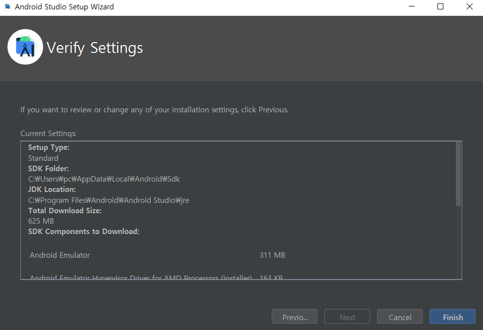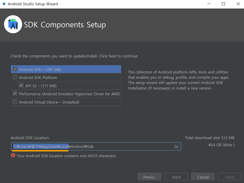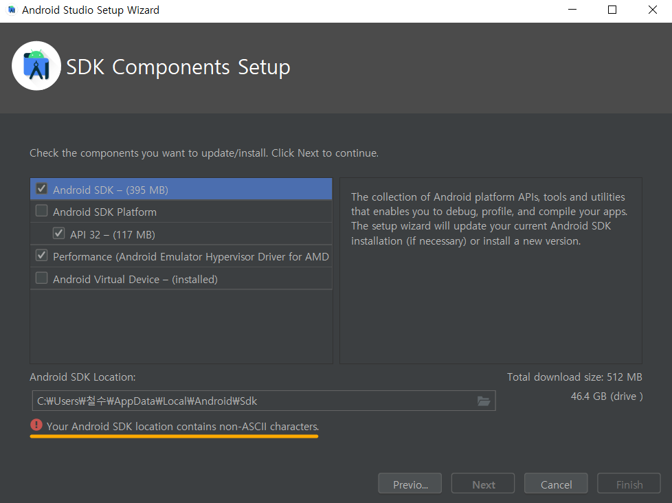 15. 만약 계정 이름이 한글이거나 띄어쓰기가 들어가 있다면Your Android SDK location contains non-ASCII characters 혹은 your path contains white space etc. 라도 뜨며 진행이 안됩니다.