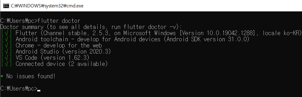 2. flutter doctor 를 입력했을 때 아래와 같이 모든 항목이 체크([v]) 되었다면 설치 완료!