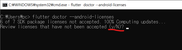 3. 문제를 해결하기 위해 flutter doctor --android-licenses를 복사해서 실행해 줍니다.