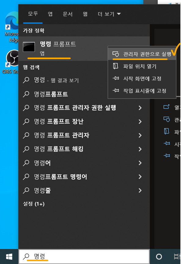 21. 윈도우 검색창에 명령이라고 검색한 뒤 명령 프롬프트를 우클릭하여 관리자 권한으로 실행해 주세요. 그냥 실행하면 안됩니다!