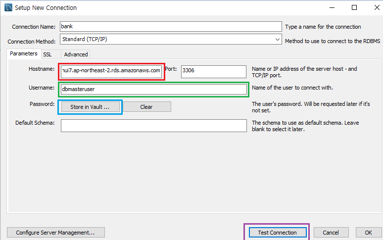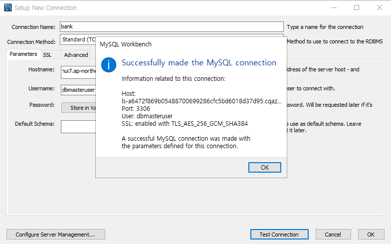 이 순서대로 진행해주시고 Test Connetion을 누르셔서 아래 화면이 나타난다면