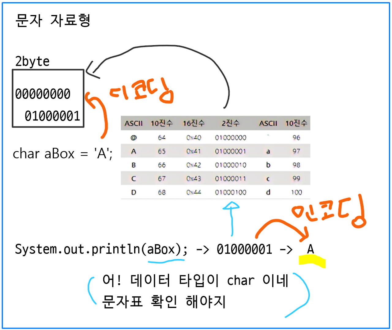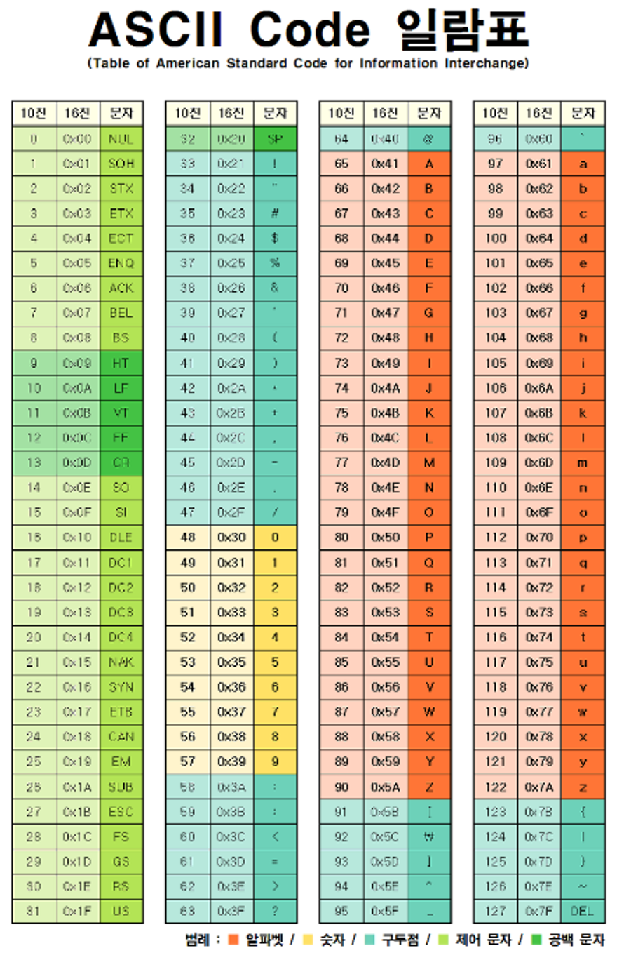 문자 자료형도 데이터인데 위에서 컴퓨터의 모든 데이터와 명령은 이진수로 표현된다고 배웠는데 문자는 컴퓨터에 어떻게 저장되고 표현이 될까?**